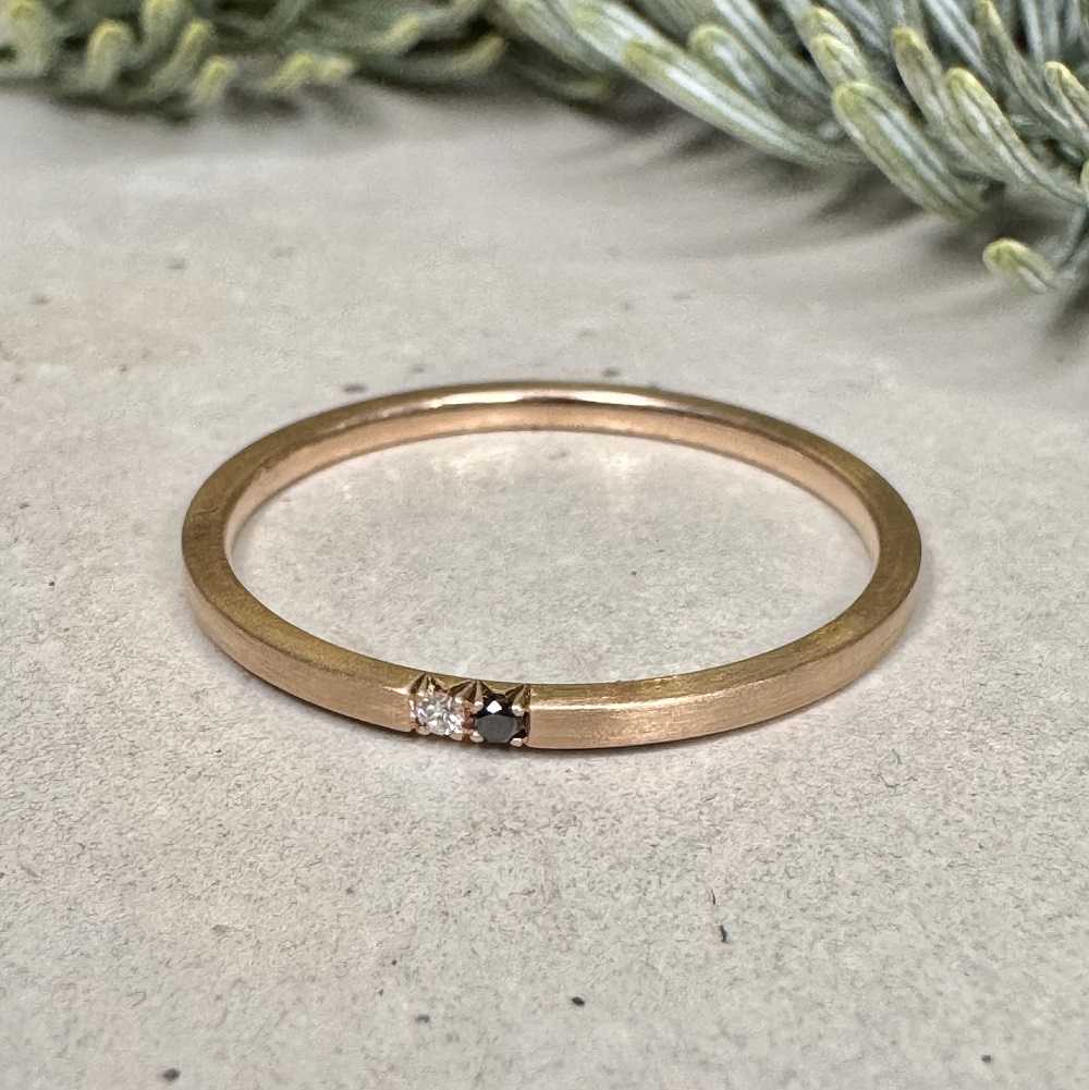 Minimalistyczna obrączka, wykonana z różowego złota próby 0,585 (14k) z czarnym i białym brylantem o łącznej masie ~0,012 ct jest dostępna “od ręki” w rozmiarze 18. Obrączka ma przekrój kwadratu o boku ~1,3 mm i ma satynowaną powierzchnię.