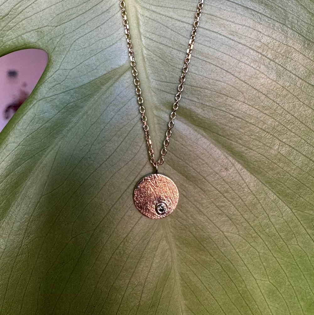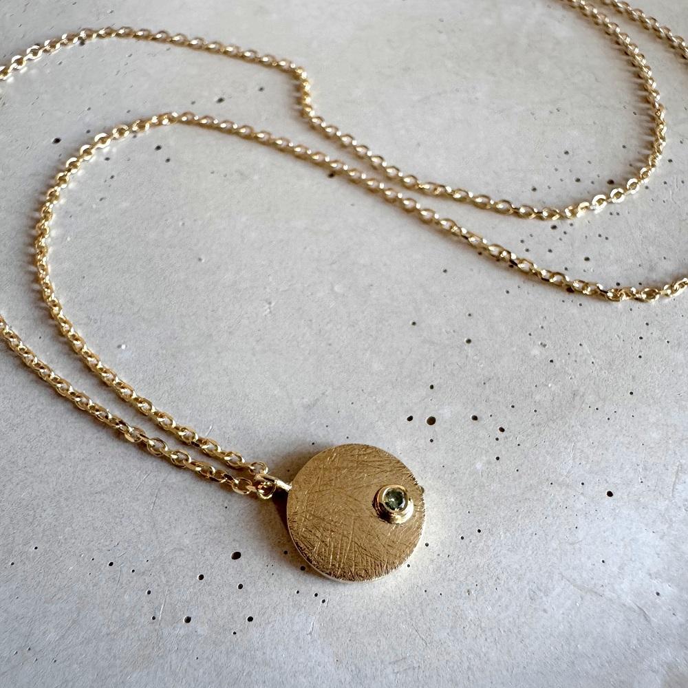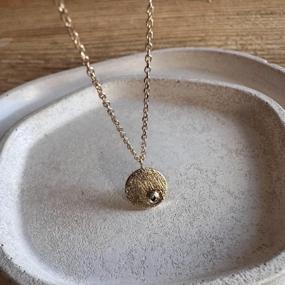 Centralnym elementem jest fakturowane kółeczko o średnicy 9 mm, którego powierzchnia pięknie odbija światło, nadając całości organiczny, lekko surowy charakter. Niecentralnie osadzony został zielony brylant o masie 0,015 ct – drobny, ale wyrazisty akcent, który subtelnie mieni się w promieniach słońca i sztucznym świetle.