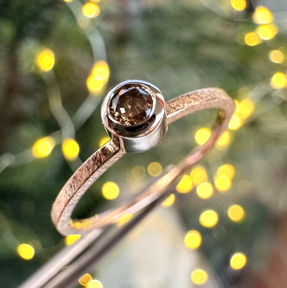 Złoty pierścionek z koniakowym brylantem „salt & pepper” – różowe i białe złoto