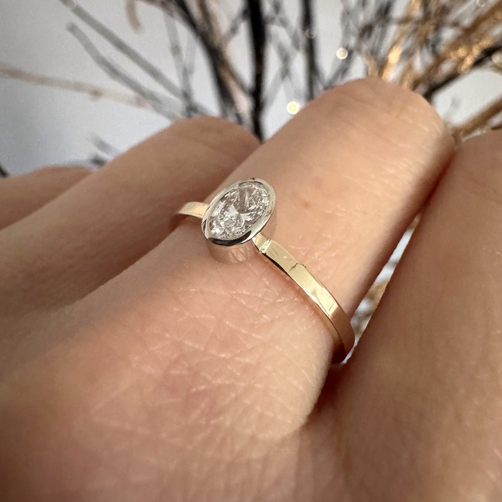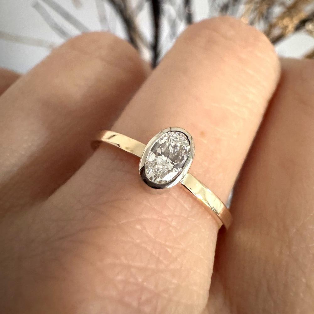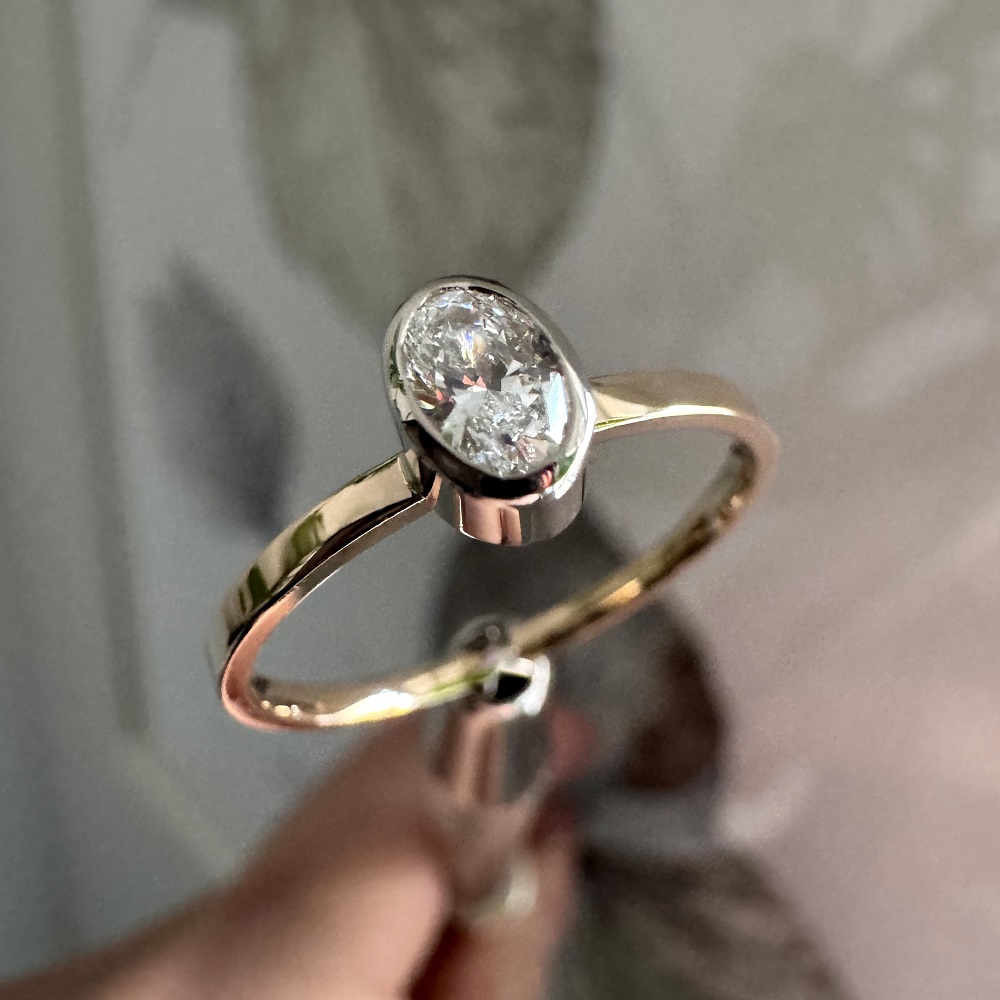 Owalny brylant o masie 0,25 ct VS1/F– mniej oczywisty niż okrągły, rzadziej spotykany, a przy tym absolutnie ponadczasowy. Gdy tylko zobaczyłyśmy ten kamień, wiedziałyśmy, że to dokładnie ten brakujący element.