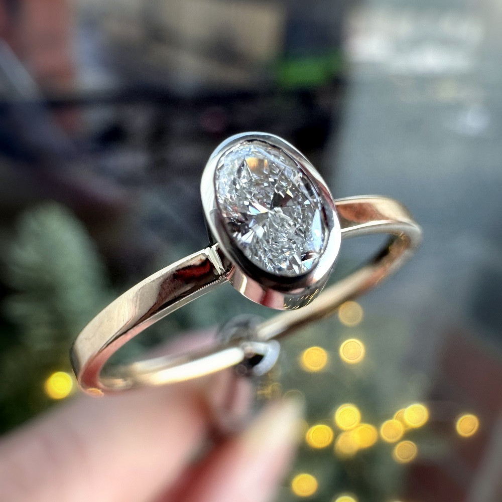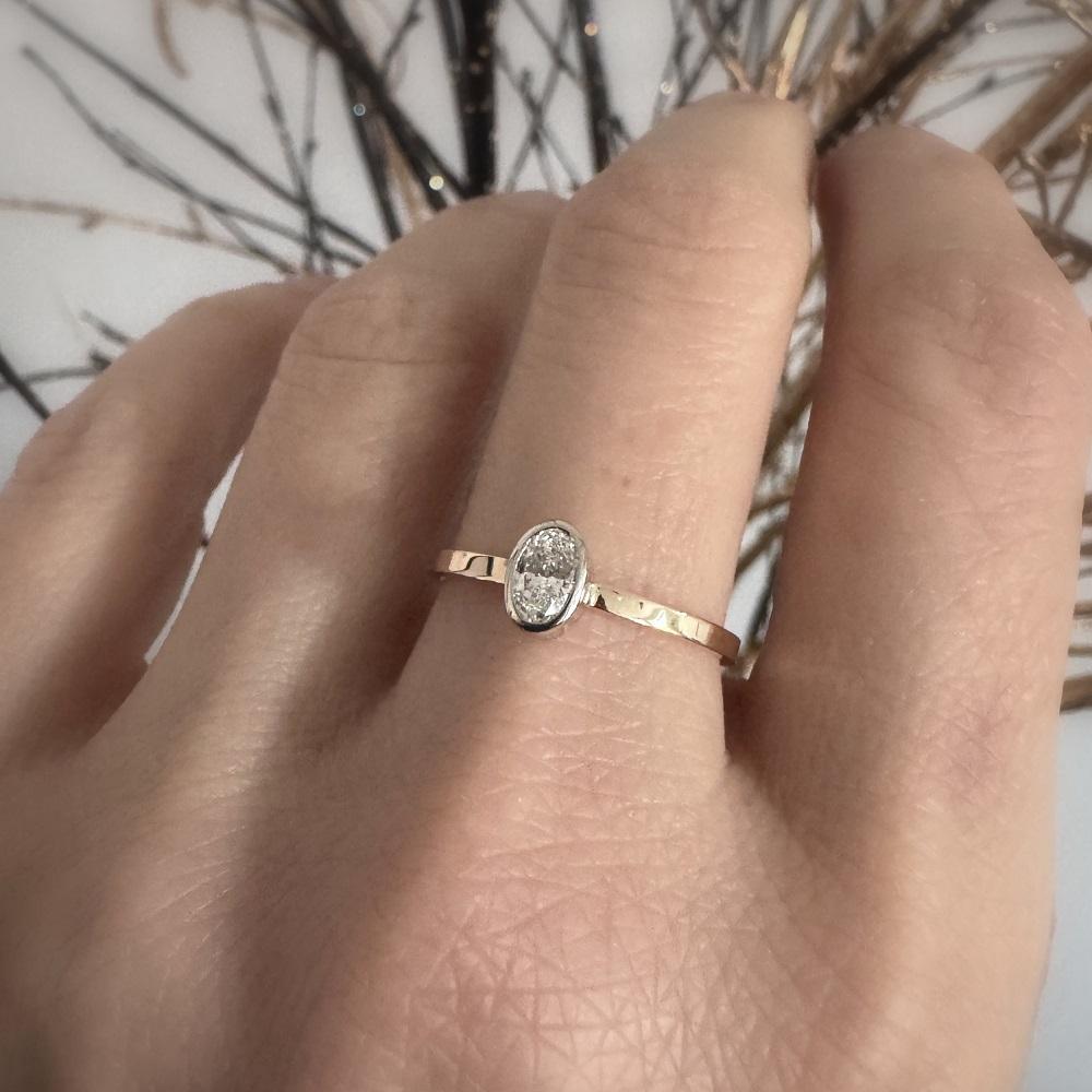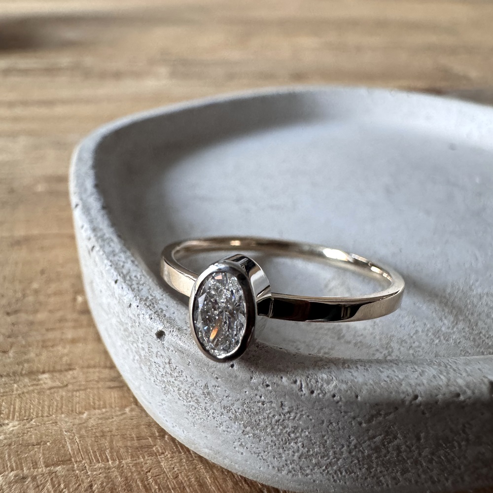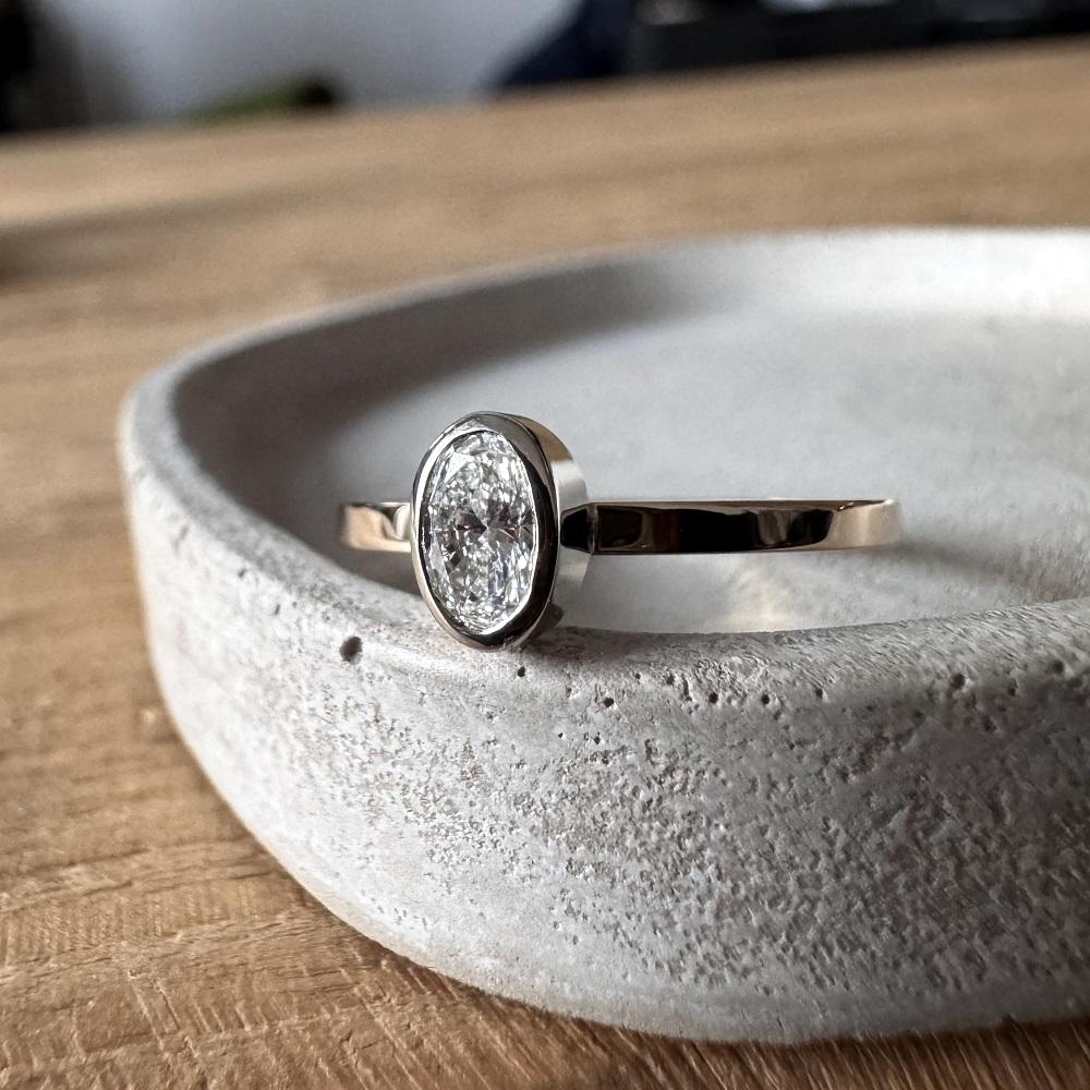 Owalny brylant o masie 0,25 ct VS1/F– mniej oczywisty niż okrągły, rzadziej spotykany, a przy tym absolutnie ponadczasowy. Gdy tylko zobaczyłyśmy ten kamień, wiedziałyśmy, że to dokładnie ten brakujący element.